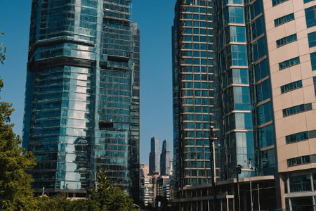 Skyscrapers tower over the cityscape, showcasing sharp angles and modern designs. The sunlight glimmers on one building, highlighting its striking features against the clear sky.