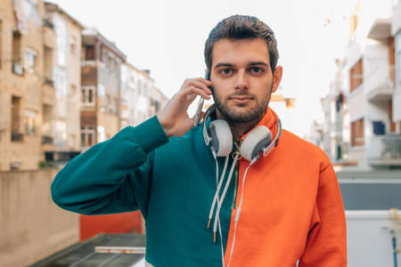 young millennial in the street with mobile phone and headphones