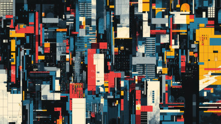 A colorful cityscape with buildings of different shapes and sizes. The colors are bright and vibrant, creating a lively and energetic atmosphere