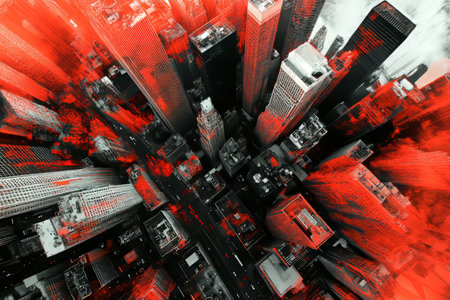 Stunning aerial view of urban buildings with vibrant red colors contrasting the cityscape