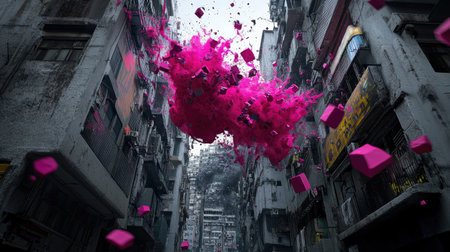A striking display of vibrant pink abstract shapes explodes in a gritty urban setting, highlighting the contrast between nature and architecture.