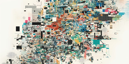 Glitch effect creates vibrant blocks and distorted patterns in urban skyline