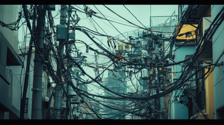 Urban infrastructure failure showing tangled electrical and telecom wires dangerously exposed