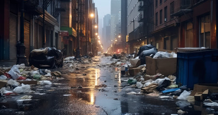 AI Generated. Street scene with debris scattered on the side of the road in an urban environment