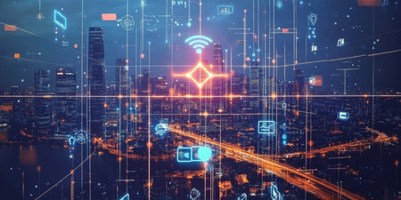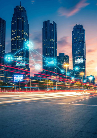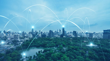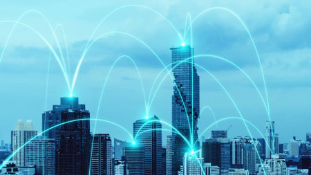 Smart city and internet concept.Technology and communication in urban landscape.Cloud computing and networking background