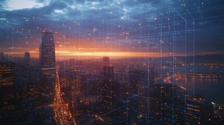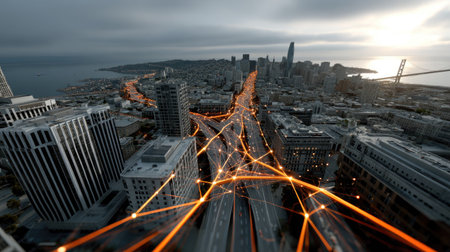 Modern San Francisco urban skyline with high-speed data and internet communication network. Concept of cyber network in big city with copy space.