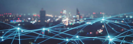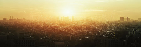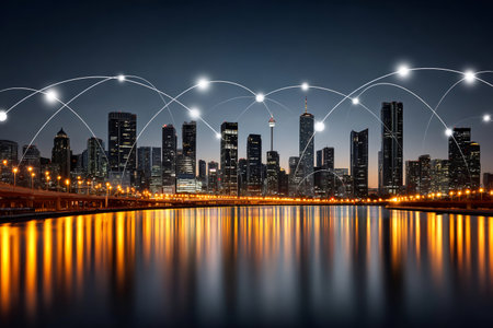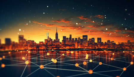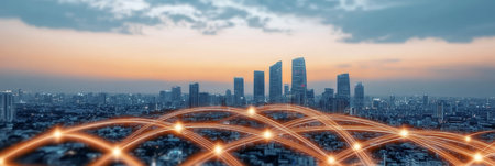 Conceptual image of digital connection lines over modern cityscape background