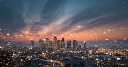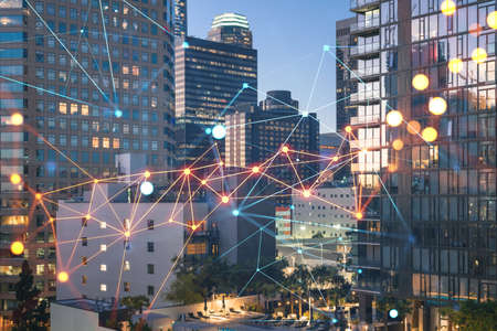 Illuminated cityscape of Los Angeles downtown at night, California, USA. Skyscrapers of LA city. Glowing Social media icons. The concept of networking and establishing new connections between people