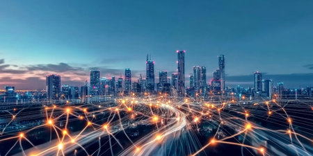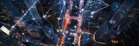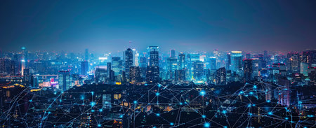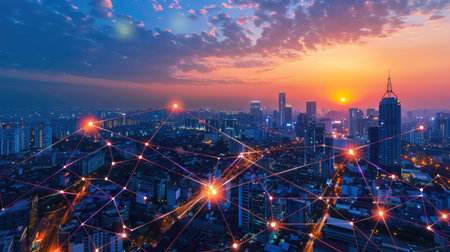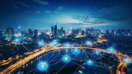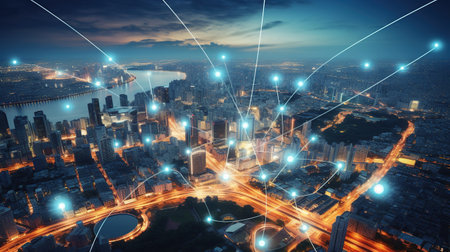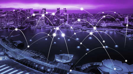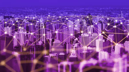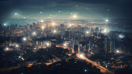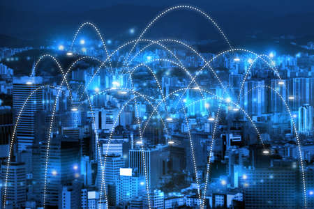 Smart city and wireless networking concept. Dot point connection technology with aerial view city background at night