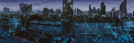 Wireless network and Connection technology concept with Abstract Bangkok city background in panorama view