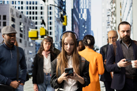 Young girl university student with big headphones texting on her mobile phone at crossroads, checking her notifications while waiting at a red light. Hipster gen z walking the street.