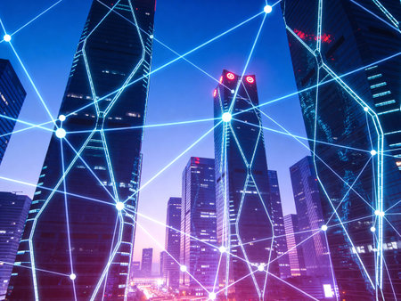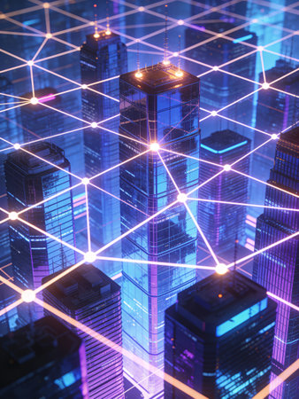 Blockchain network on blurred skyscrapers background. Financial technology and communication concept.