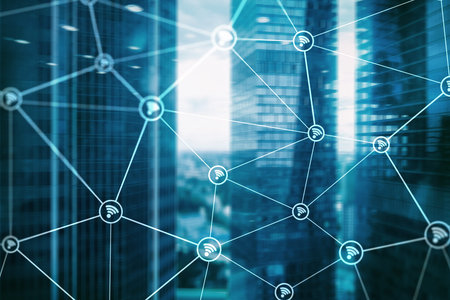 Wireless network and Connection technology concept with Abstract buildings and city background
