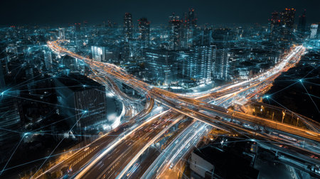 Technology hologram on aerial view of road, busy urban traffic highway at night. Junction network of transportation infrastructure. The concept of developing high-tech science in logistics.