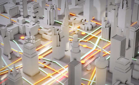 3D Render Abstract city. City plan, streets and skyscrapers with neon traffic lights effect