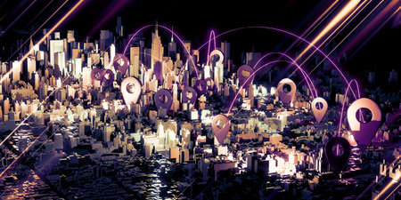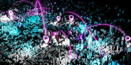 Creative illuminated night city background with digital map pointer connections. Smart city, gps and navigation concept