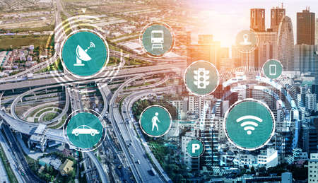 Smart transport technology concept for future car traffic on road . Virtual intelligent system makes digital information analysis to connect data of vehicle on city street . Futuristic innovation .