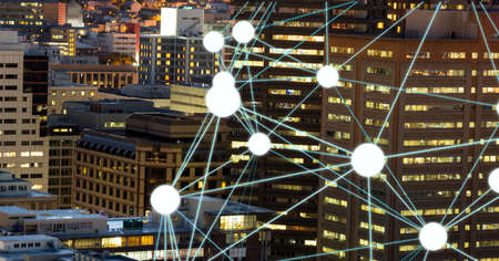 Image of floating digital network of connections over modern buildings. Global digital network technology finance concept digitally generated image.