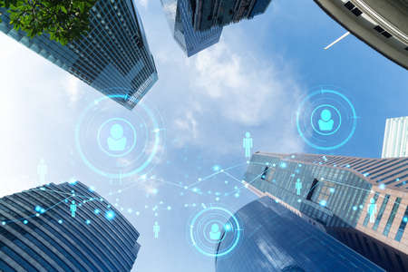 Social media icons hologram over low angle shot of Singapore skyscrapers, Southeast Asia. The concept of people networking, connections and career opportunities. Double exposure.