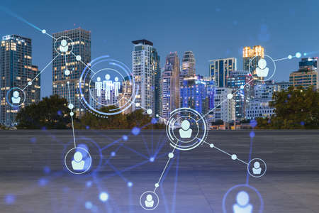 Rooftop with concrete terrace, Bangkok night skyline. Recruitment process to hire candidates for international business consulting. HR, networking digital icons. City downtown. Double exposure.