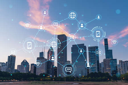 Chicago skyline from Butler Field to financial district skyscrapers at sunset, Illinois, USA. Parks and gardens. Social media hologram. Concept of networking and establishing new people connections