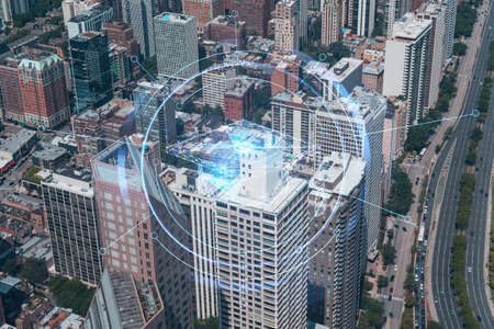 Aerial panoramic city view, Chicago downtown area, day time, Illinois, USA. Birds eye view, skyscrapers, skyline. Education concept. Academic research, top ranking universities, hologram
