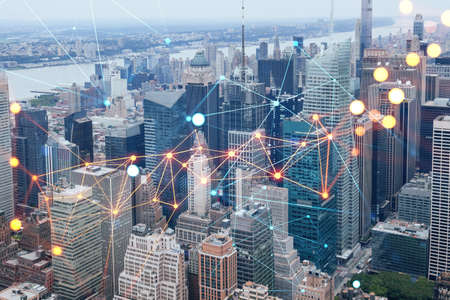 Aerial panoramic city view of Time Square area, Manhattan West Side and the Hudson River, New York city, USA. Social media hologram. Concept of networking and establishing new people connections
