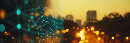 Displaying network graphic overlaying utility pole wires at street intersection, with moving cars. Urban, connectivity, transportation, communication, digital, infrastructure, modern