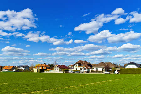 Village in the countryside. Fields and sky with clouds
