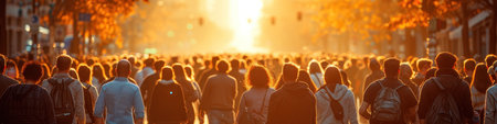 Crowd of people walking on wide city street with sunset at the background., City life, social issues concept