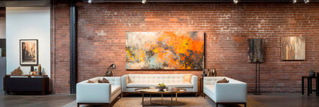 airy and modern loft lobby with exposed brick walls, industrial lighting, and contemporary artwork. Generative AI