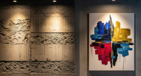 Abstract colorful painting on wall with textured concrete background in dim lighting