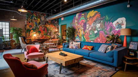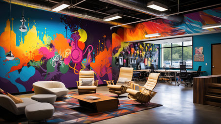 A vibrant modern office space featuring an eye-catching abstract mural, stylish seating, and a creative atmosphere that inspires collaboration and innovation.