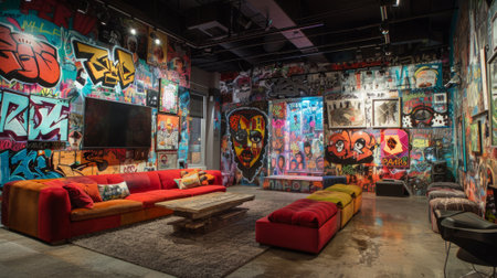 urban graffiti art, unique blend of graffiti styles and techniques combined in an energetic and visually dynamic way in the interior space