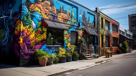 This captivating image showcases a beautiful urban setting with modern architecture naturally intertwined with greenery and colorful street art, creating a lively atmosphere.