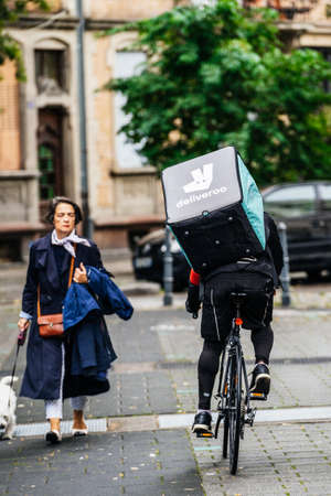 Paris, France - Sep 12, 2017: Rear view of Deliveroo cyclist fast cycling on French street delivering food with nearby walking women bicycle food delivery