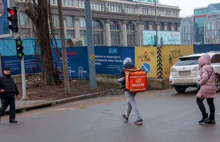 Dnepropetrovsk, Ukraine - 02.10.2022: A delivery service courier with a thermal bag walks through the city. home food delivery.