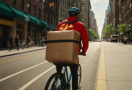 A man rides a bicycle in an urban environment, delivering food. The scene captures everyday city life and work.