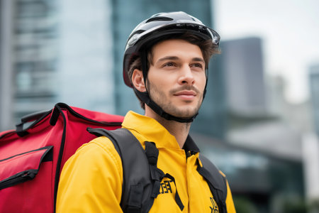 A confident food delivery cyclist pauses in the city, showing his bright yellow uniform and thermal bag. Urban backdrop.