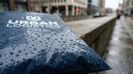 A delivery rider in a blue jacket transports a parcel on a scooter through rainy city streets.