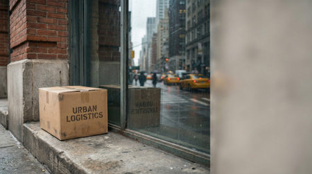 A delivery worker with a joyful expression is holding a cardboard box and approaching a delivery van. The background showcases a bustling urban setting with soft bokeh lights.