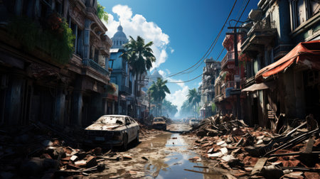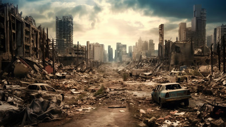 Post apocalypse after war or earthquake, apocalyptic destroyed city, generative AI. Futuristic urban landscape with rubble and buildings ruins. Concept of destruction, battlefield, future, zombie.