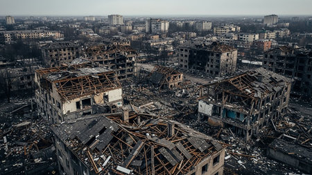 Aerial view of a city with heavily damaged apartment buildings and widespread debris under a gray, overcast sky.