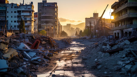 A street in a destroyed city at sunset, with ruined buildings, scattered debris, and furniture on the road, bathed in warm light.