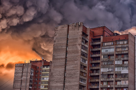 Black smoke from the conflagration rises up and goes over the misty roofs of city houses in the early morning against the backdrop of the cityscape.