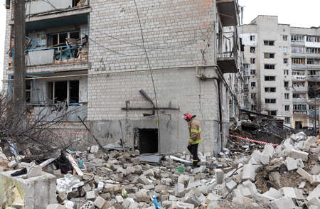 KYIV, UKRAINE - Mar. 14, 2022: War in Ukraine. Completely destroyed residential building that was hit by a shell, as Russia's attack on Ukraine continues, in the Obolon district in Kyiv