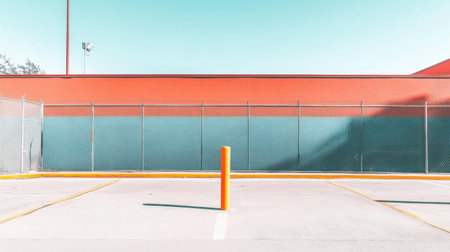 This image showcases an empty parking lot featuring a bright orange pole against a colorful backdrop. The minimalistic scene emphasizes geometry and open space.