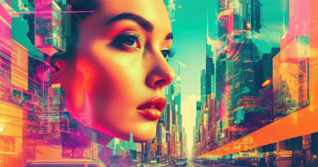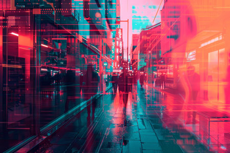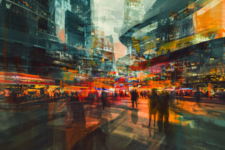 Abstract city street scene with a colorful, dreamlike double exposure effect, blending urban life and fantasy.