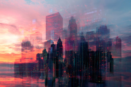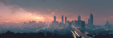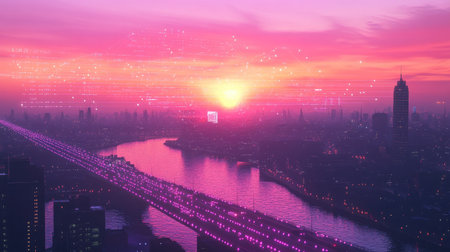 Vibrant sunset over the city, overlaid with tech-style digital paths and nodes illustrating a high-tech urban future