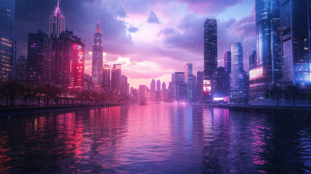 A stunning view of a city skyline at twilight, where tall buildings are illuminated by vibrant colors. The reflections shimmer on the calm water, creating a mesmerizing atmosphere.
